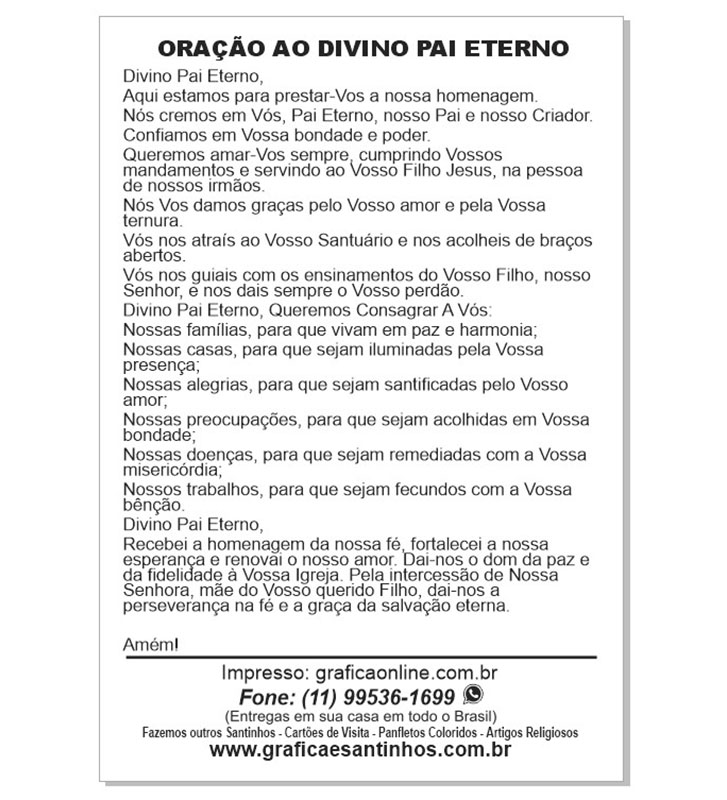 Em agradecimento, mande imprimir e distribuir um milheiro desta oração, para propagar os benefícios do grande Divino Pai Eterno. Mande imprimir você também logo após o pedido.
